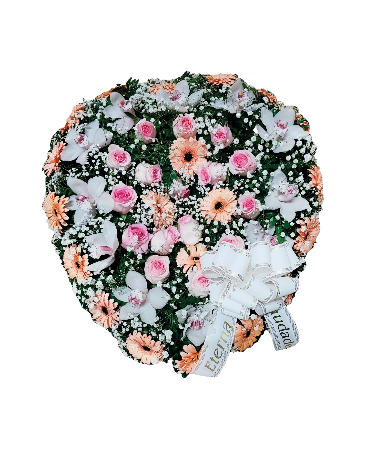 Apresenta um arranjo floral circular com uma delicada combinação de flores em tons pastel. As rosas rosa claro e as gerberas são os elementos principais, complementados por orquídeas brancas que acrescentam um toque de sofisticação e elegante. Pequenas gypsophilas brancas (mosquitinhos) espalham-se entre as flores maiores, conferindo ocupações e preenchendo os espaços de maneira harmoniosa.